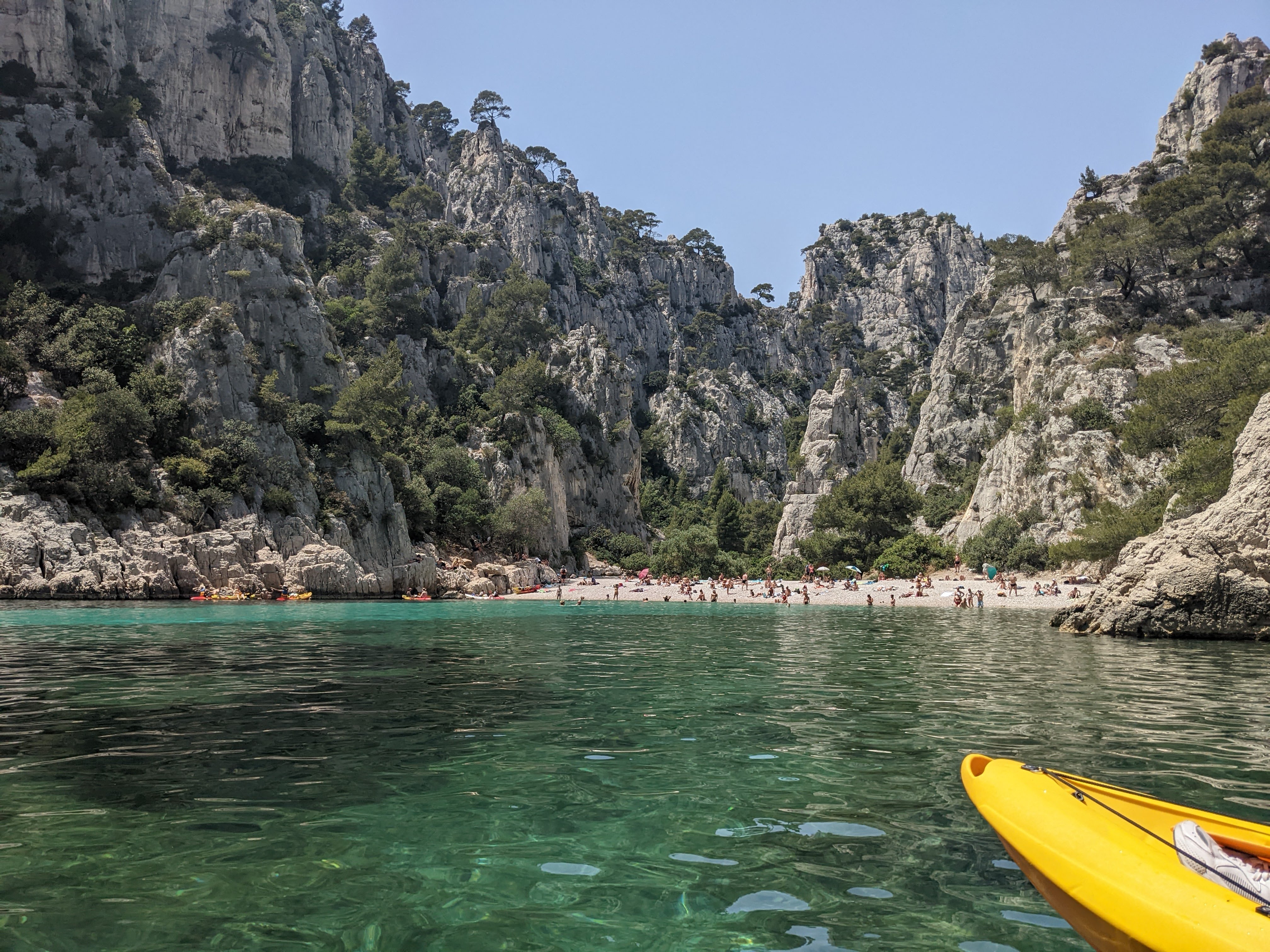 J'ai réservé pour deux personnes pour faire 3 calanques. Arrivée à 11h30 pour rendez-vous 12h. CATASTROPHE aucune place de disponible. En plus un kayakiste concurrent nous fais peur en nous annonçant que à cette heure on trouvera pas de place qu'il fallait venir plus tôt. Bref plus de peur que de mal nous avons pris la place d'une personne du groupe du matin. Mais je pense qu'effectivement il est préférable de venir tôt le matin pour être tranquille. Nous aurions donc dû choisir l'heure du matin. Pour preuve une parti des personnes de notre groupe n'a pas trouvé de place sur le petit parking. Ce qui a considérablement retardé le départ. Sinon, visite agréable des calanques, j'ai trouvé le guide un peu trop réservé. J'avais l'impression qu'il faisait sa balade à lui. Je ne l'ai pas trouvé chaleureux. Il expliquait cependant chaque calanque, ou vestiges que l'on voyait. Les calanques sont magnifiques la couleur de l'eau est à couper le souffle. Il y avait beaucoup de monde mais ça n'enlève pas de charme à l'endroit. Nous sommes contentes de cette excursion en kayak juste déçu de l'organisation du début.